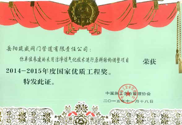河南心連心化肥有限公司采用潔凈煤氣化技術進行原料結構調整項目尿素裝置高 壓管道采用推拉式冷彎發明專利技術實施管道工廠化施工榮獲國家優質工程獎